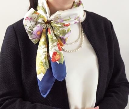 肌寒くなるこの季節のおしゃれにはシルクのスカーフを取り入れてみるのはいかがでしょうか。