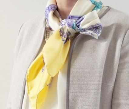 きちんと感を出しつつも女性らしい華やかさをプラスしてくれるスカーフを使ったスタイリング。