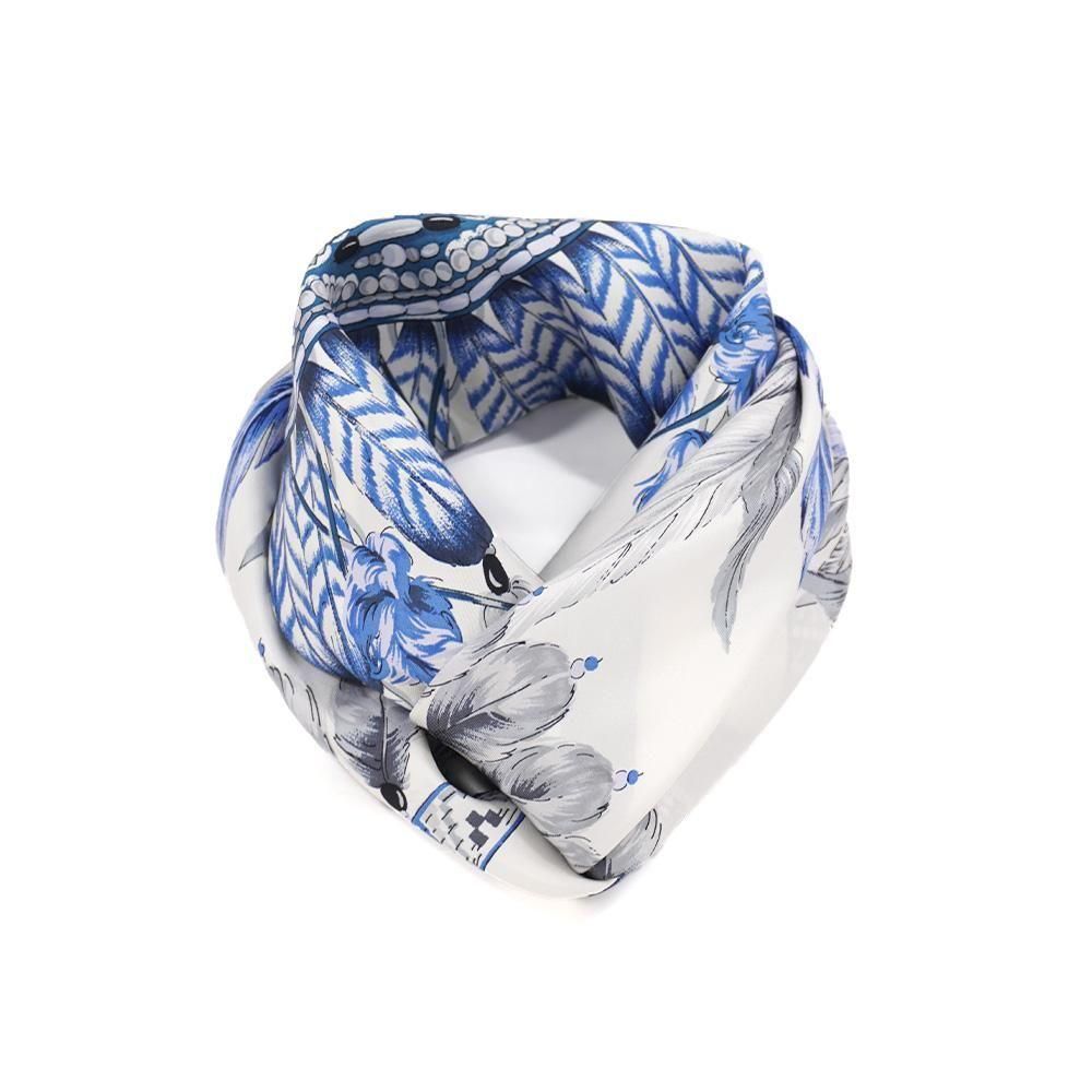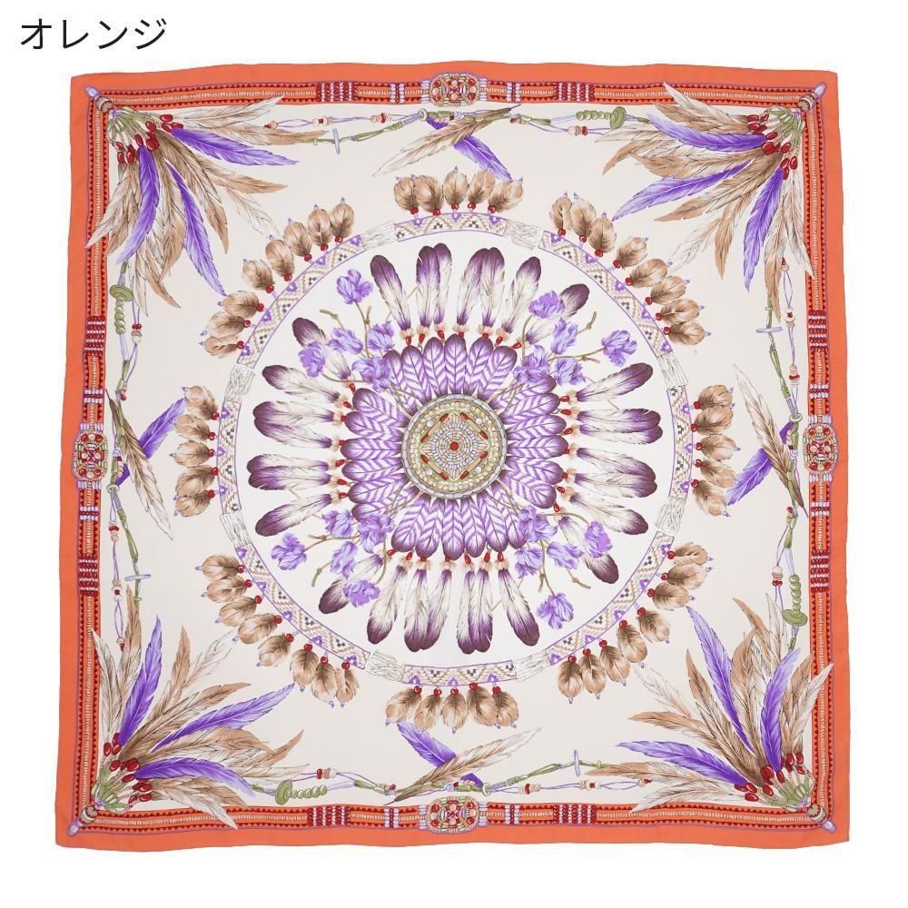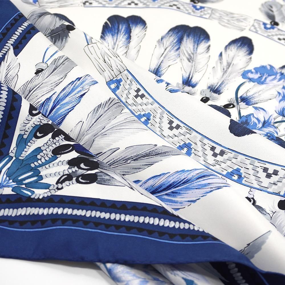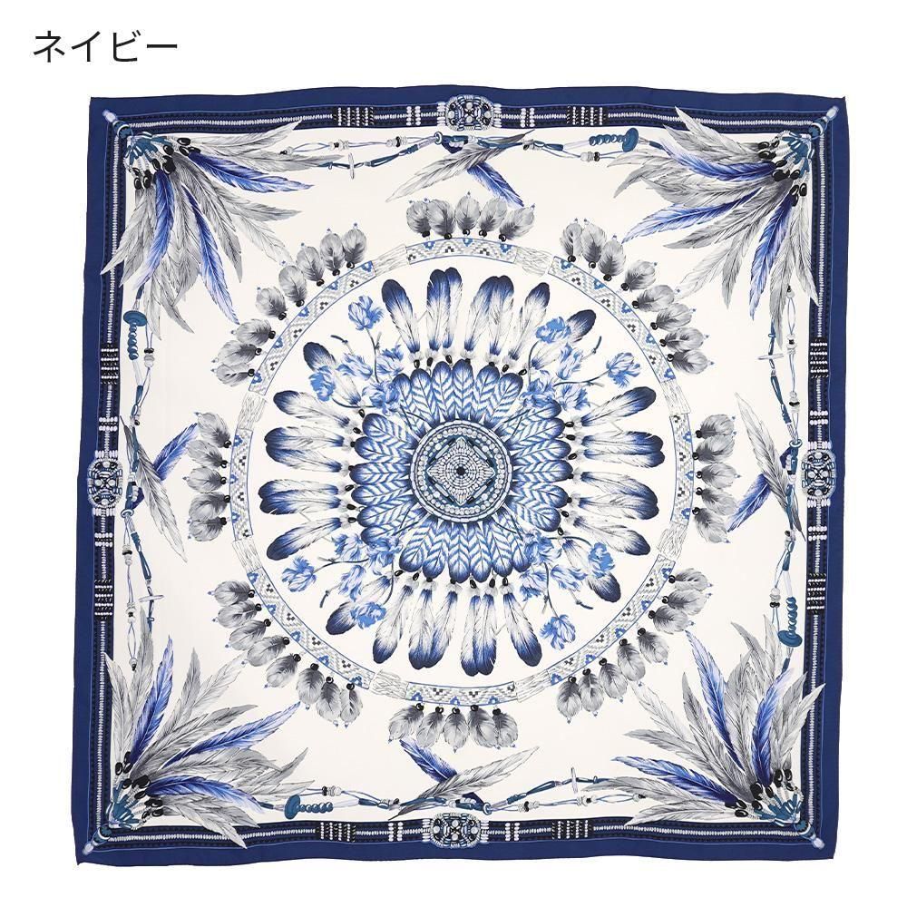 羽根飾り(フェザー)をモチーフとしてスクエアのデザインに丁寧に描いたスカーフです。繊細な羽根の質感まで表現しました。