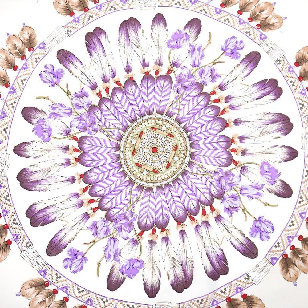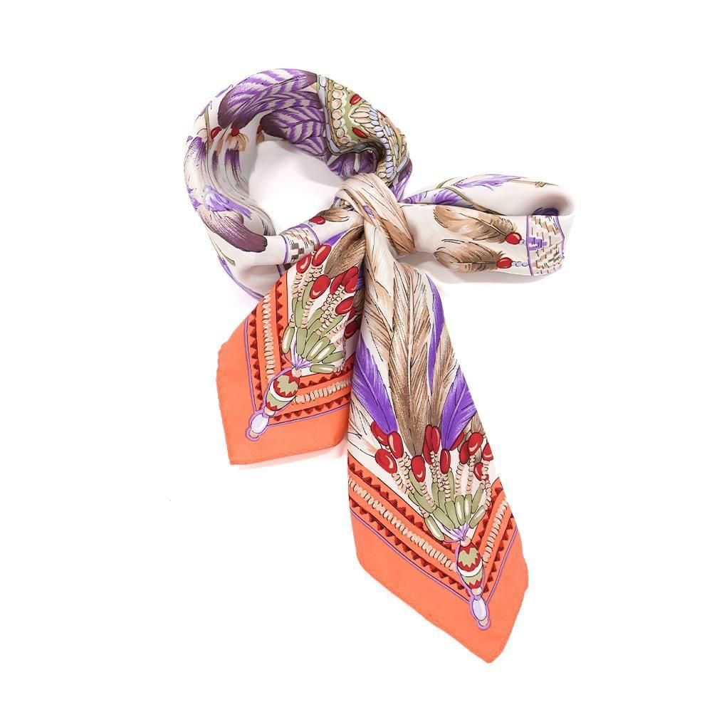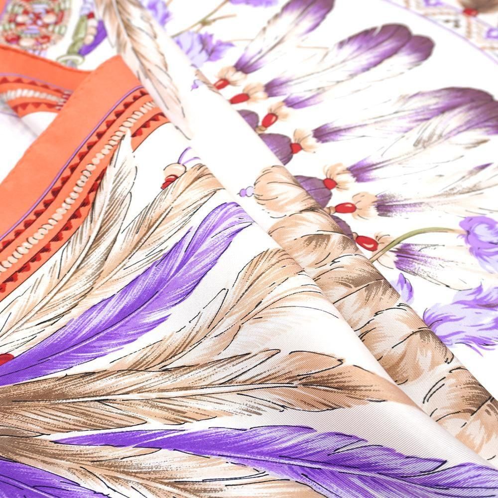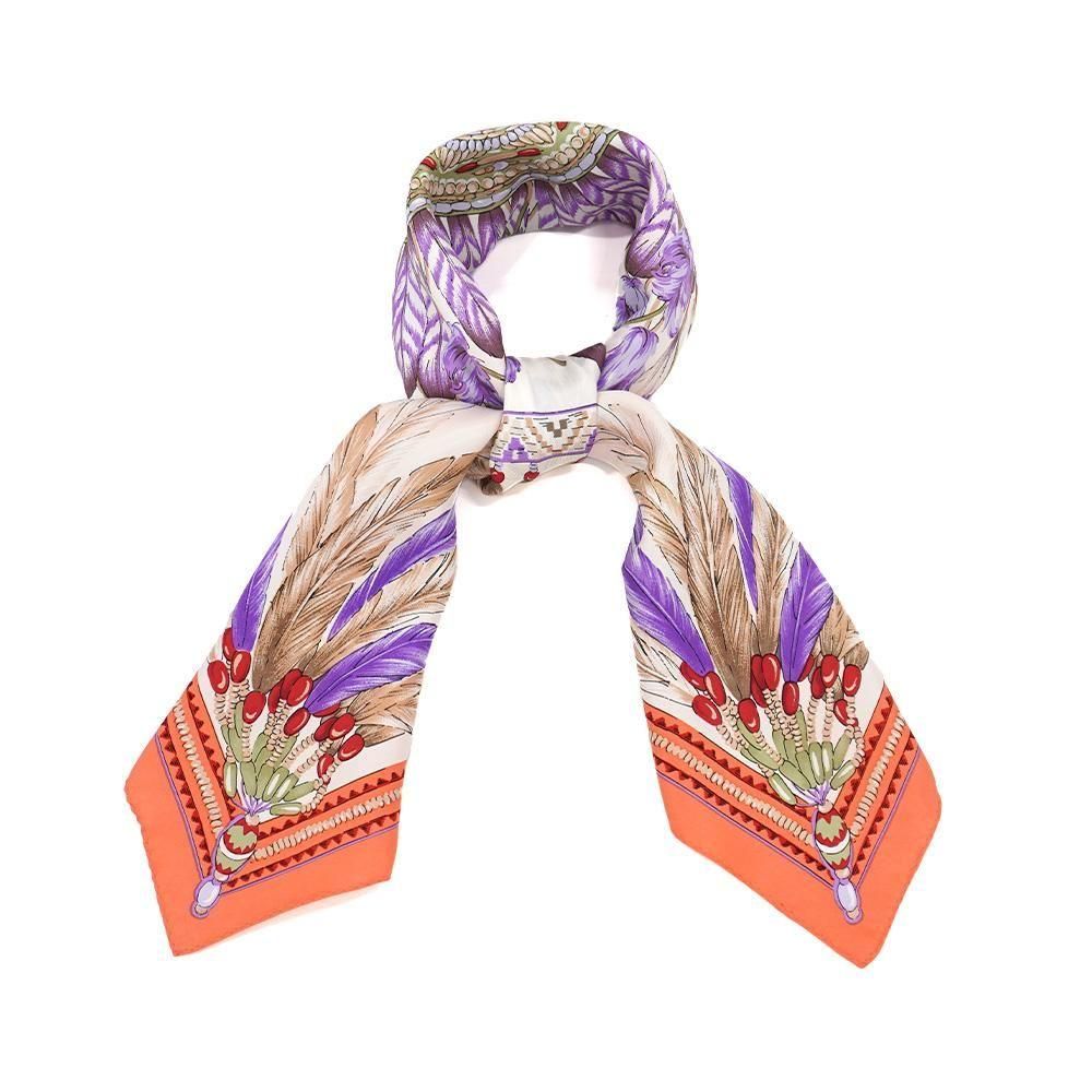 羽根飾り(フェザー)をモチーフとしてスクエアのデザインに丁寧に描いたスカーフです。繊細な羽根の質感まで表現しました。
