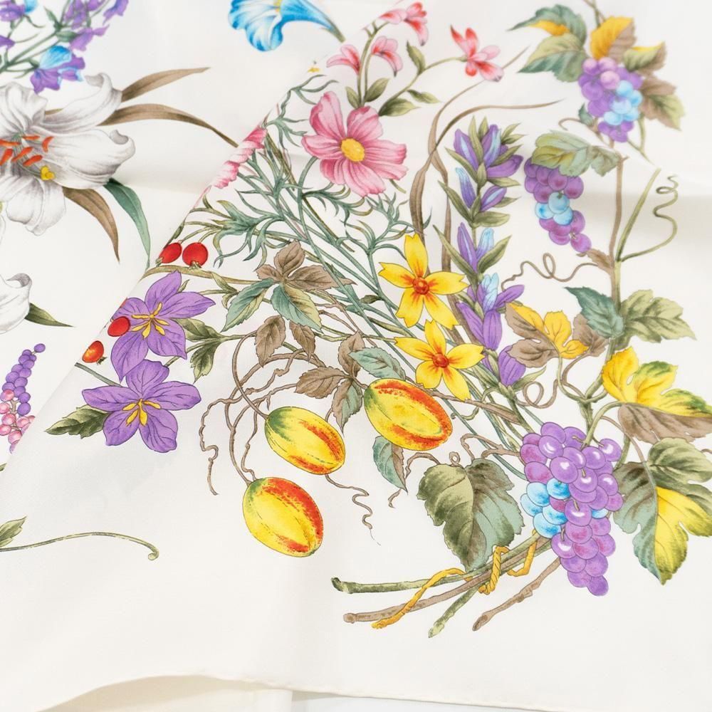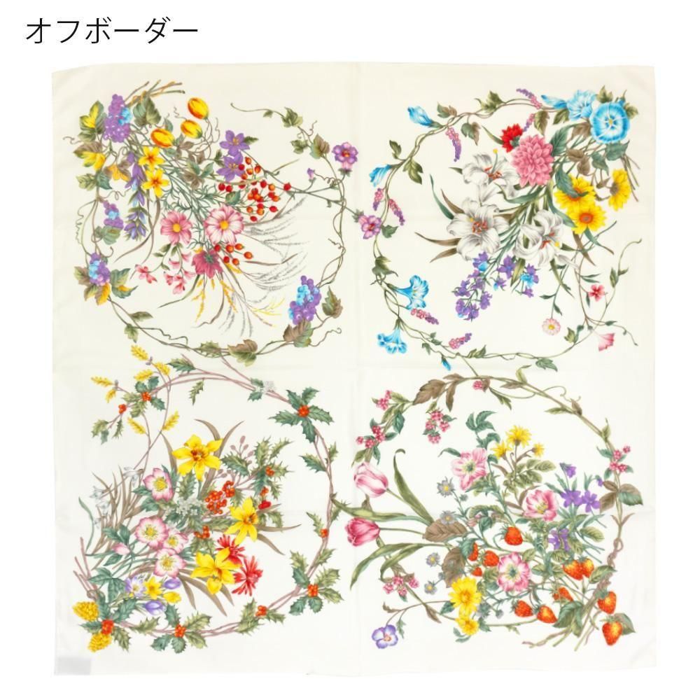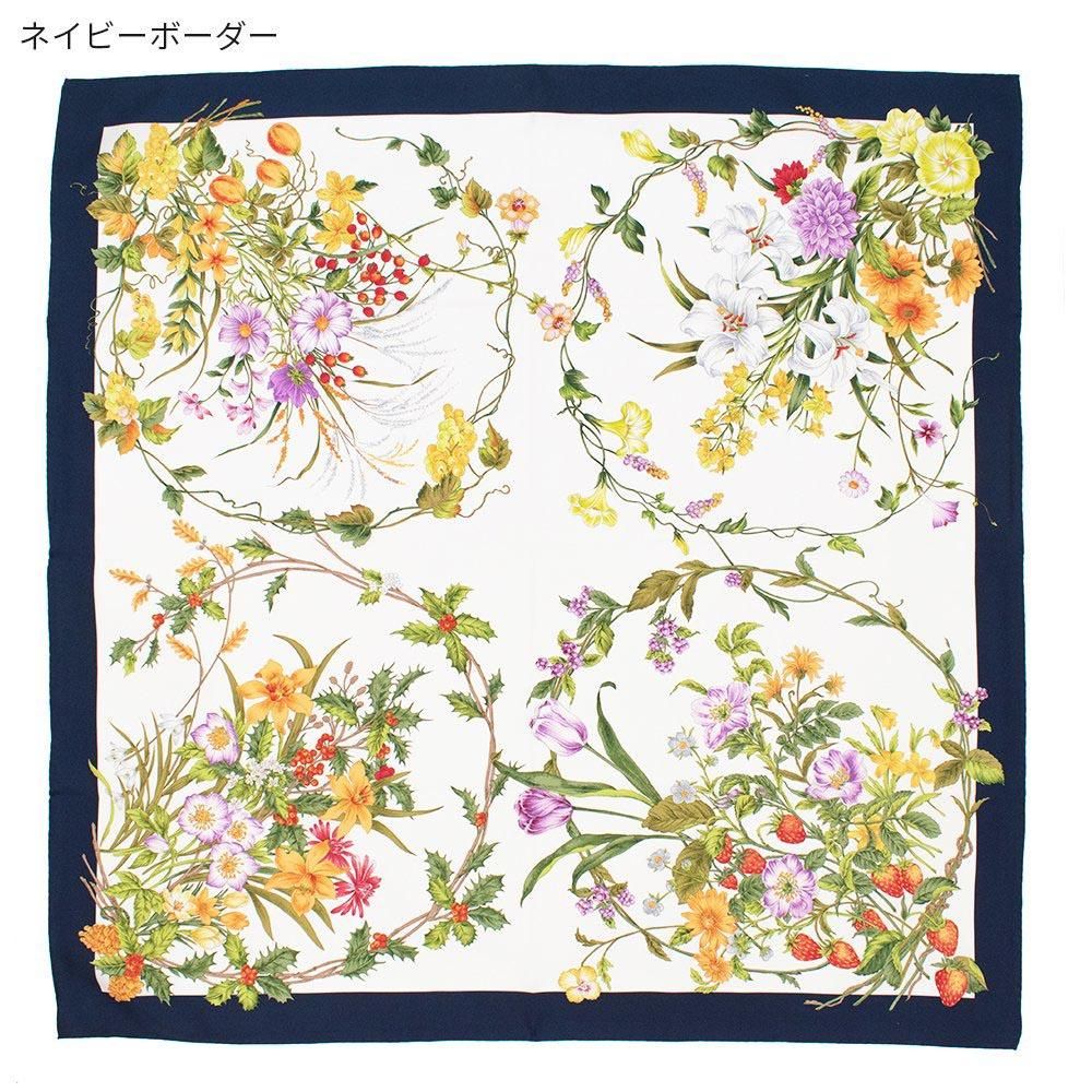 コーナー(四隅)それぞれに季節の代表的な花々をリースのように丁寧に描いたスカーフです。