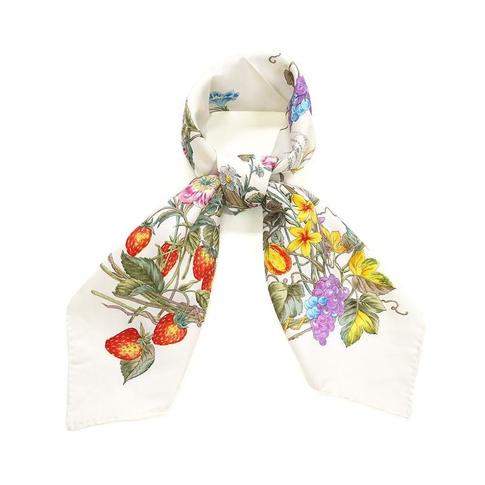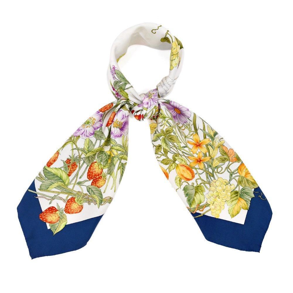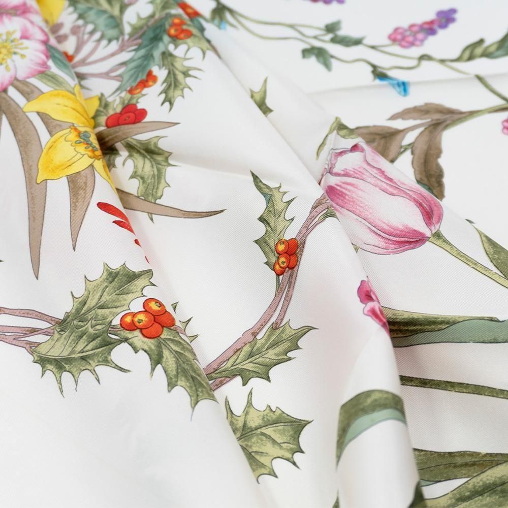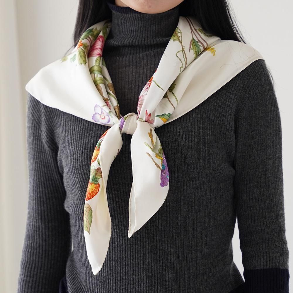 コーナー(四隅)それぞれに季節の代表的な花々をリースのように丁寧に描いたスカーフです。