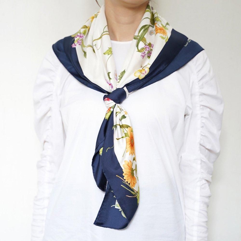 モチーフの花々は巻くたびに異なる見え方をするので、気分によって巻き方を変えてみるのもおすすめです。
