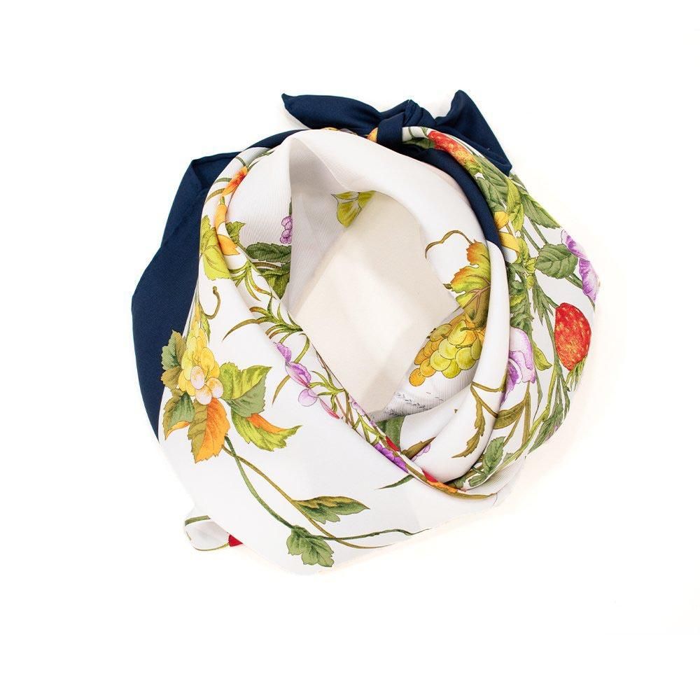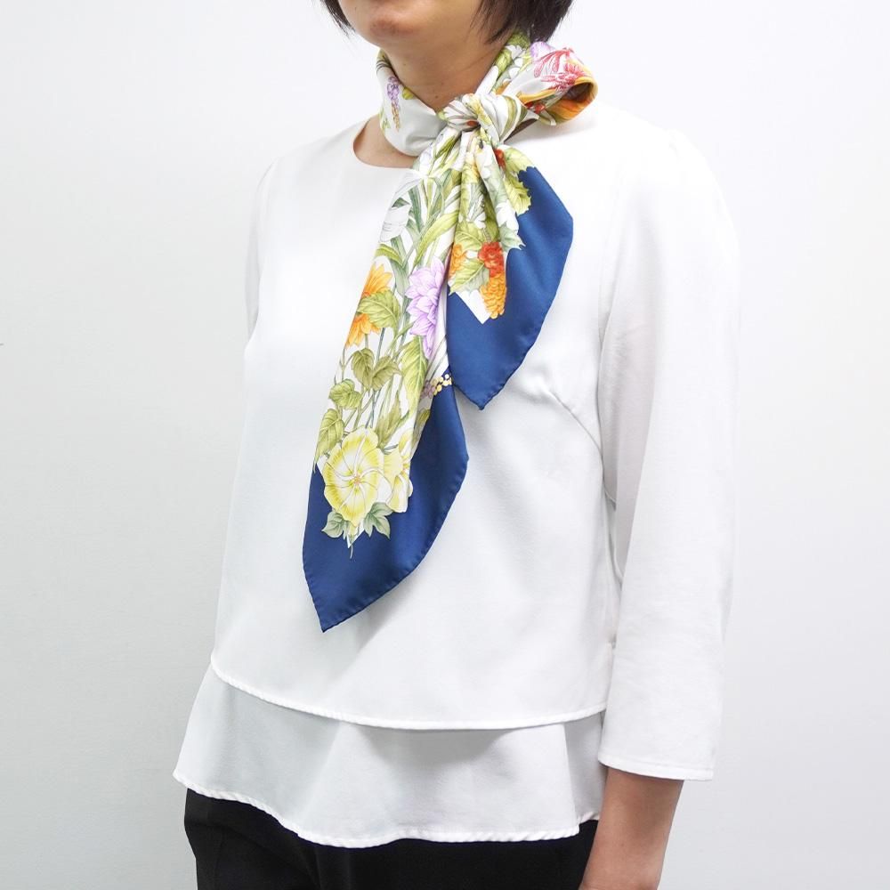 白地のスカーフは光を反射させてお顔色を明るく魅せるレフ版効果があります。