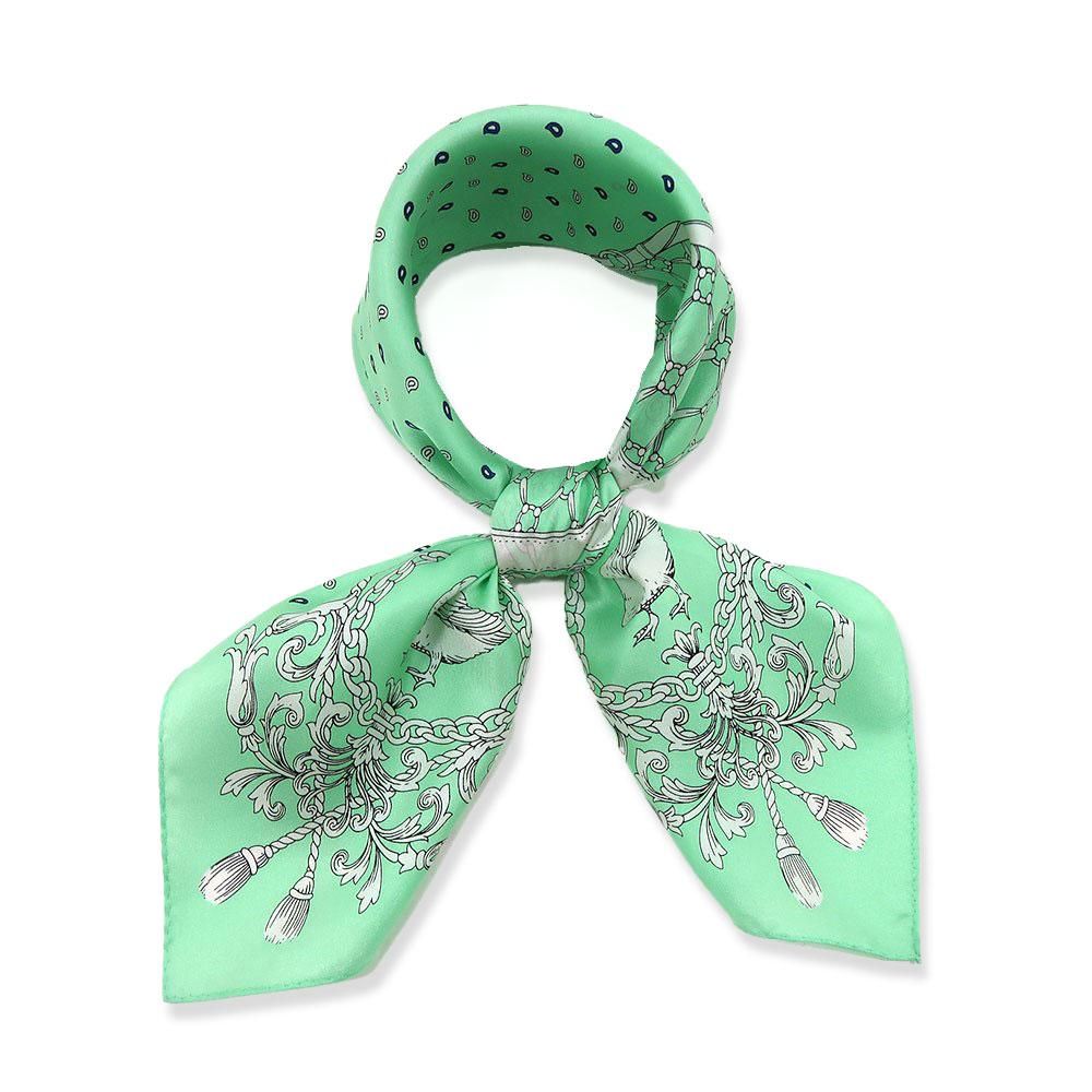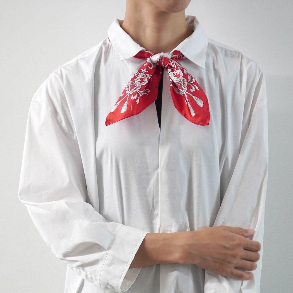 素材は薄手のシルクツイルなので軽い使い心地で首元にさらりと巻いていただけます。小さめのサイズ感なので首元以外に手首やバッグに巻いていただくのもおすすめです。