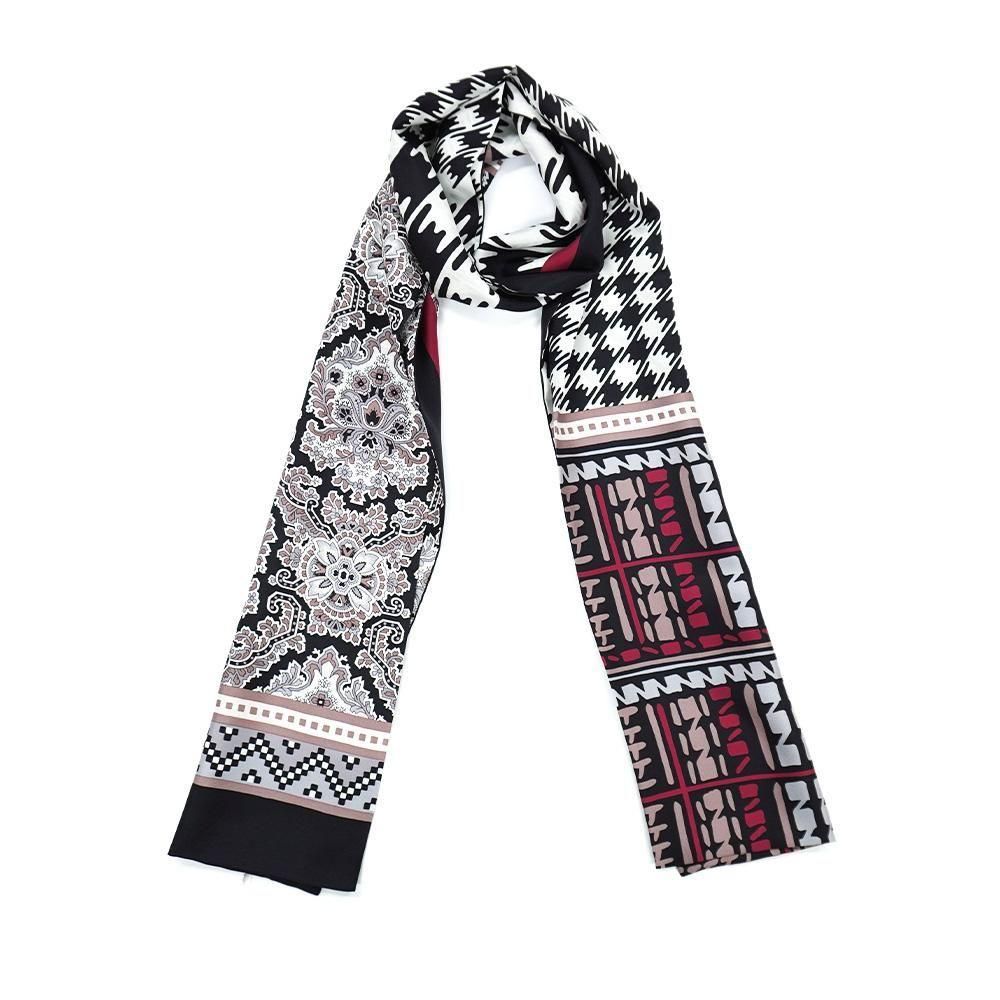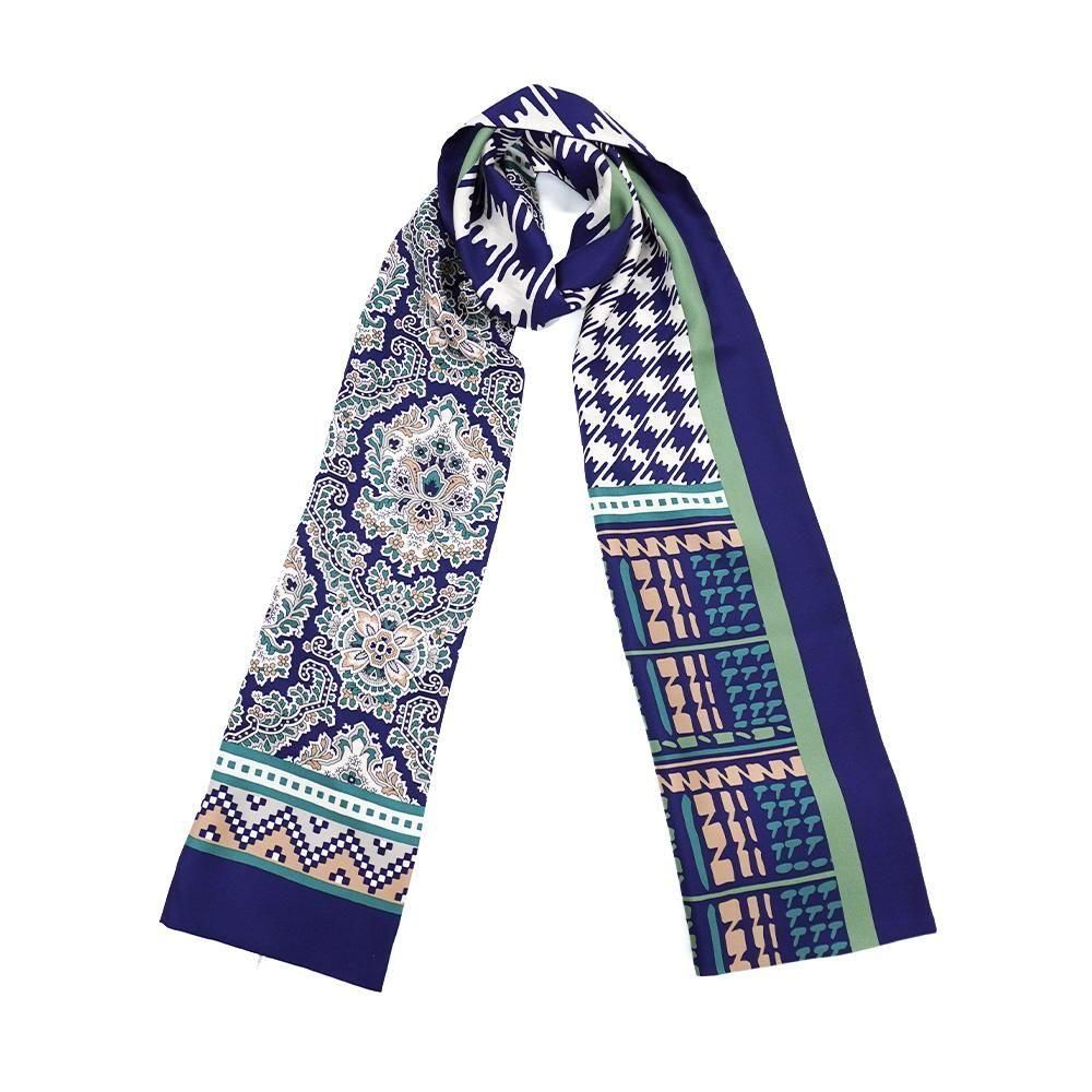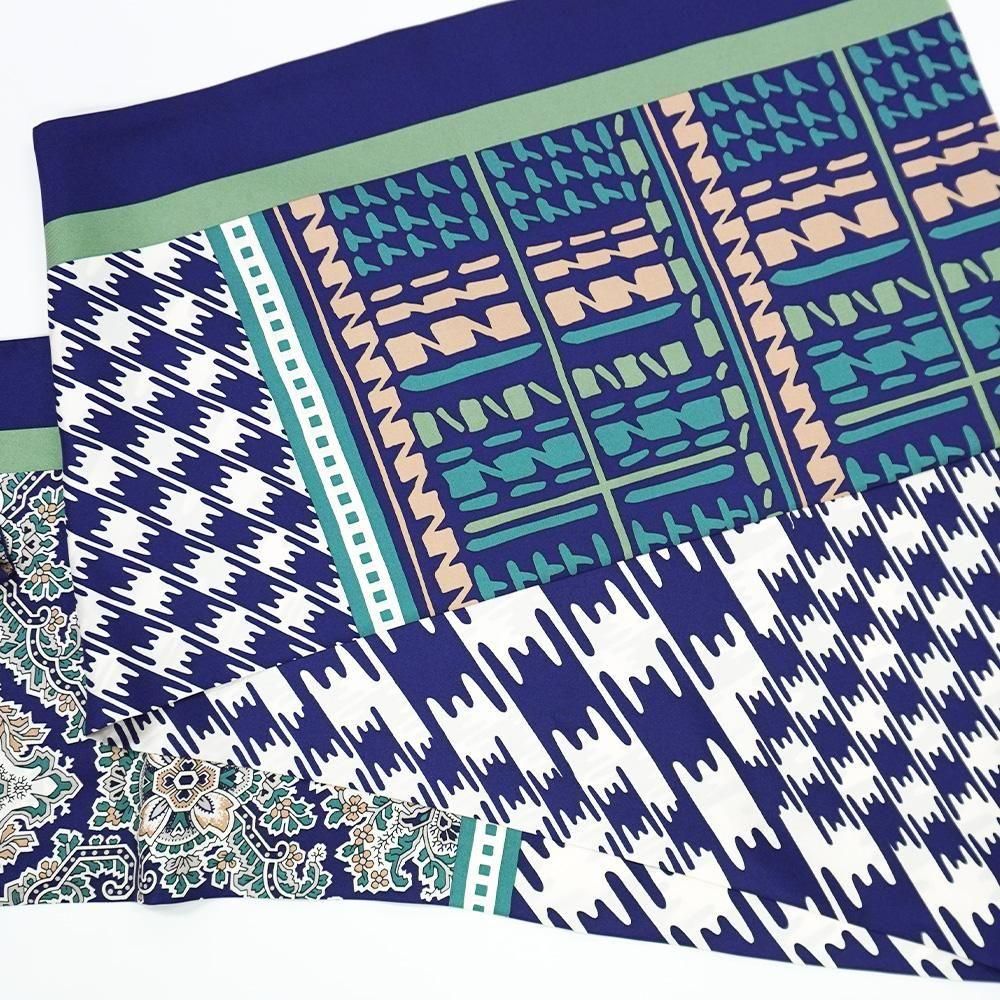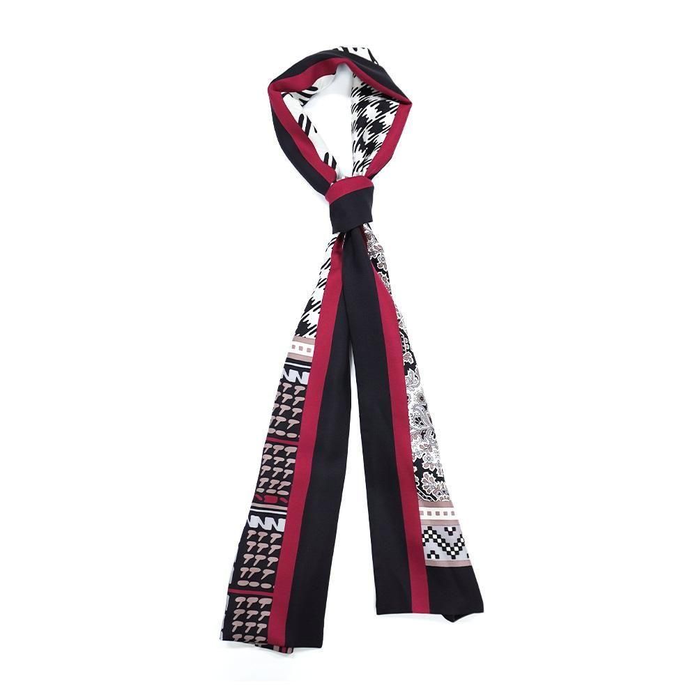 レトロな幾何柄や様々な描き方のチェックをコラージュにした袋タイプのナロースカーフです。二つ折りにしてストールのように巻くことで気軽に自分らしいスタイルを作ることが出来ます。