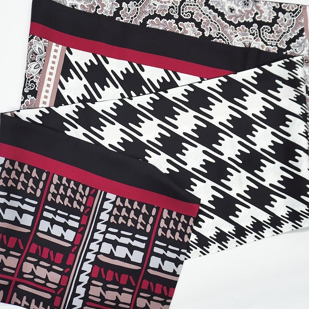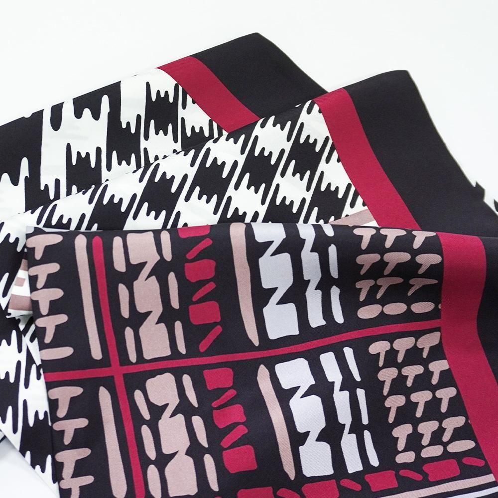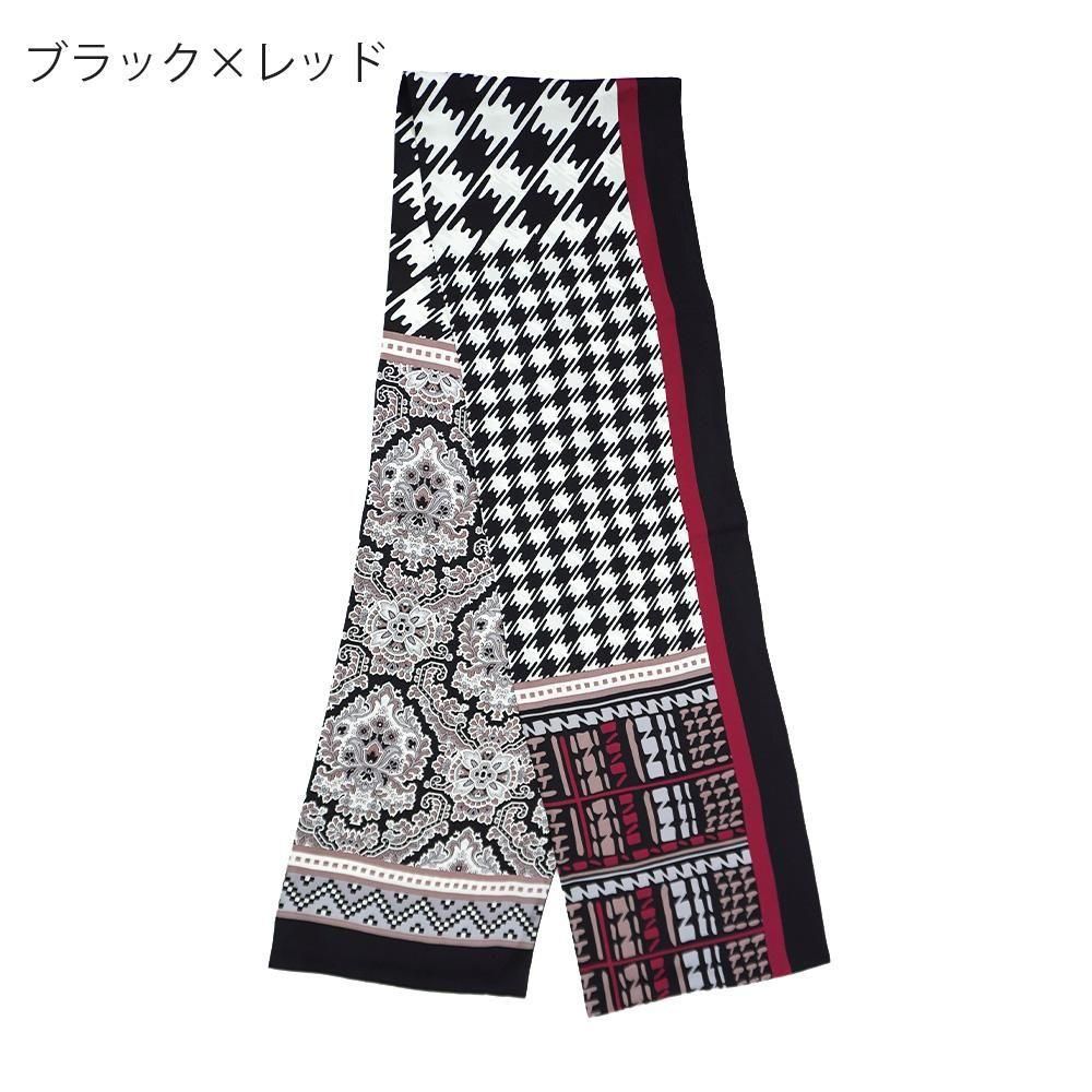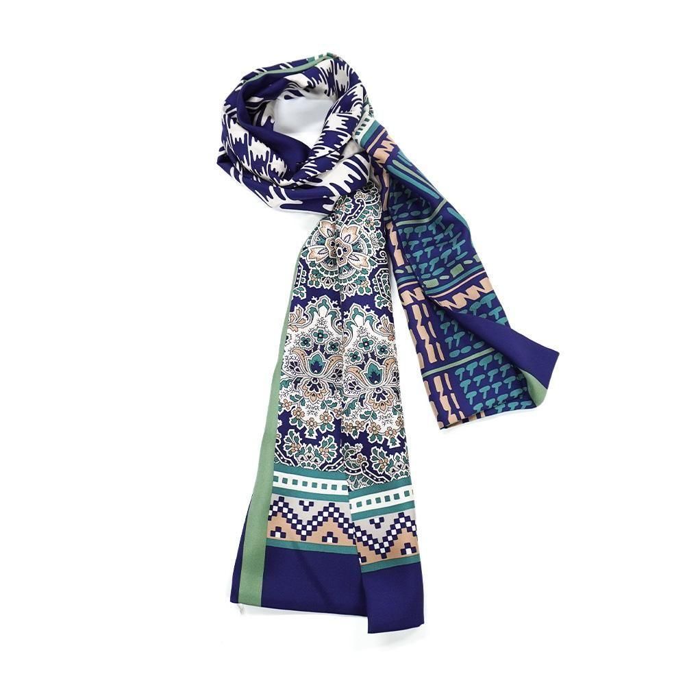 レトロな幾何柄や様々な描き方のチェックをコラージュにした袋タイプのナロースカーフです。二つ折りにしてストールのように巻くことで気軽に自分らしいスタイルを作ることが出来ます。