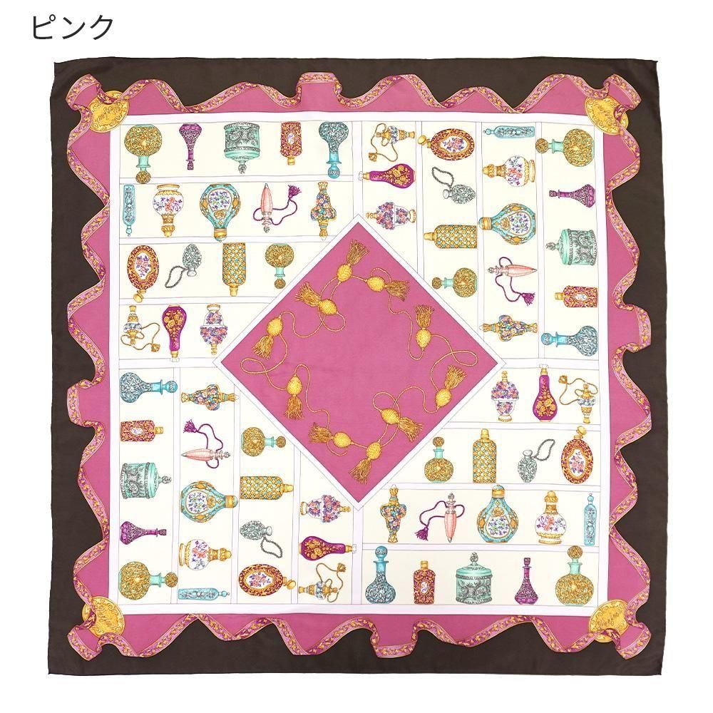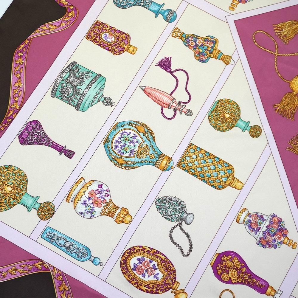 装飾された色々なデザイン、カラーリングの香水瓶をひとつずつ丁寧にスクエアの構図に描いた大判のシルクスカーフです。