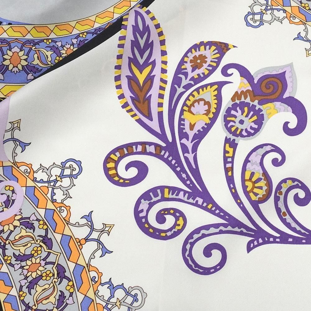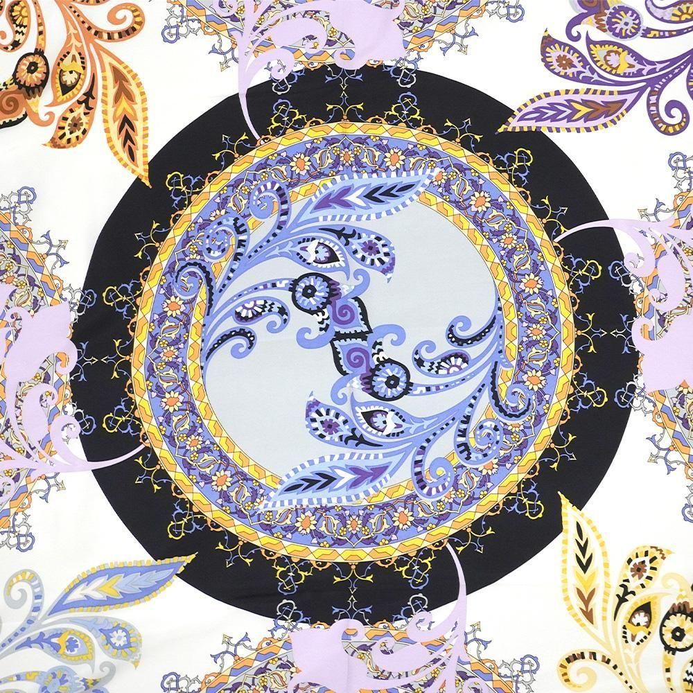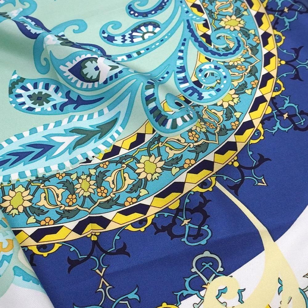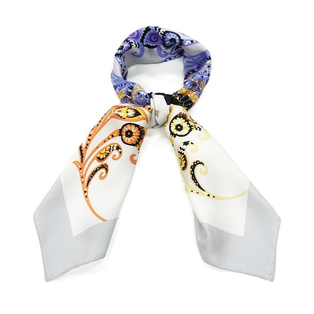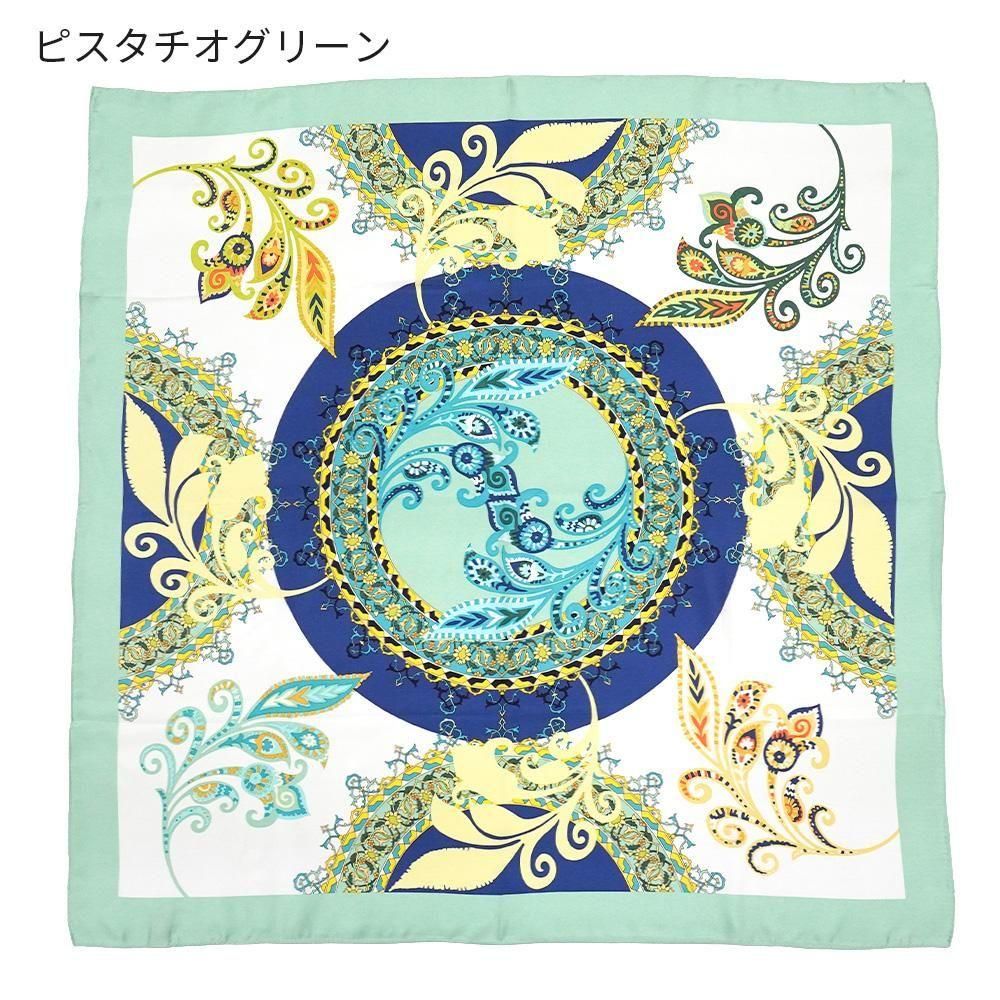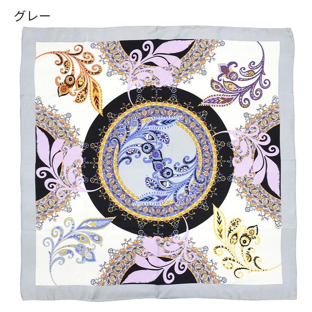 更紗調の文様を、リズミカルなサークル状にデザインしたスカーフです。>明るいカラーリングで、身に着けるとお顔周りがパッと華やぎます。
