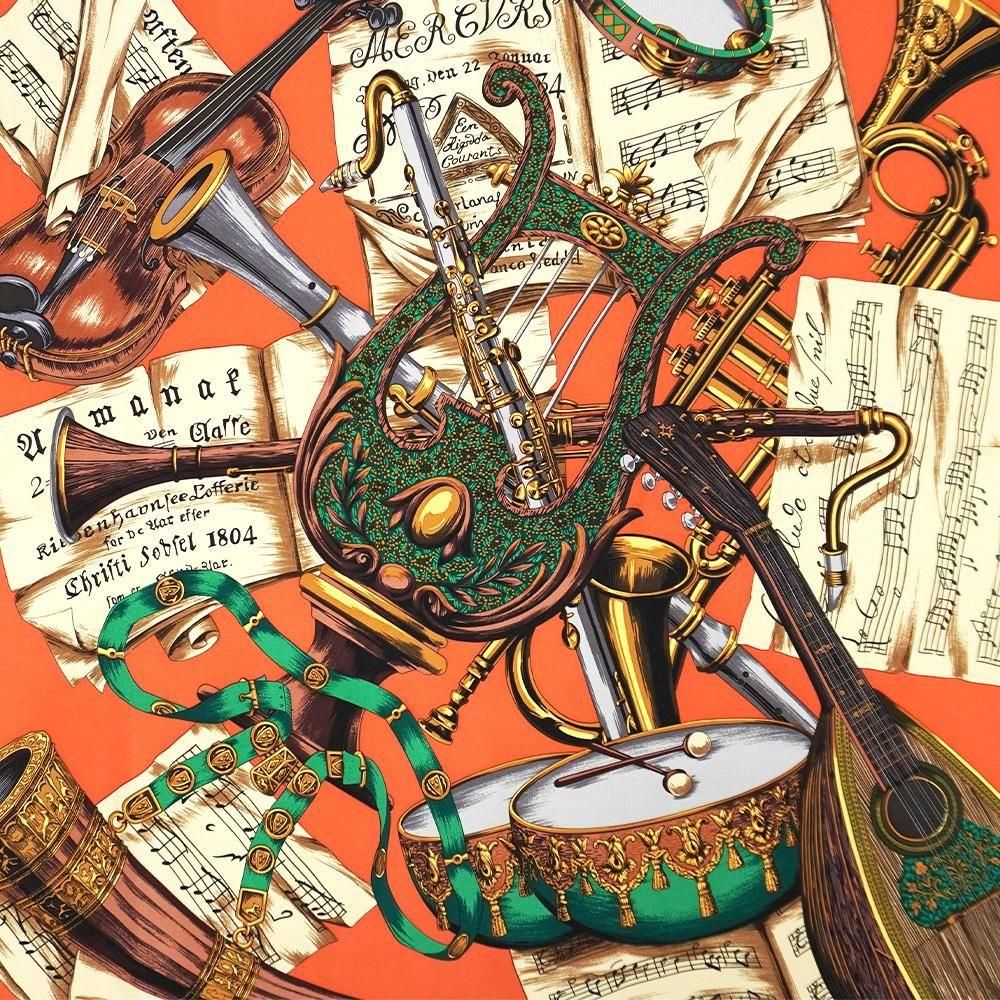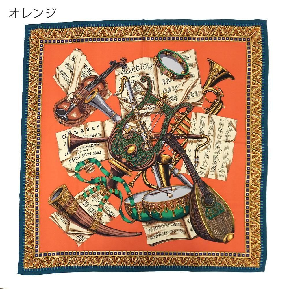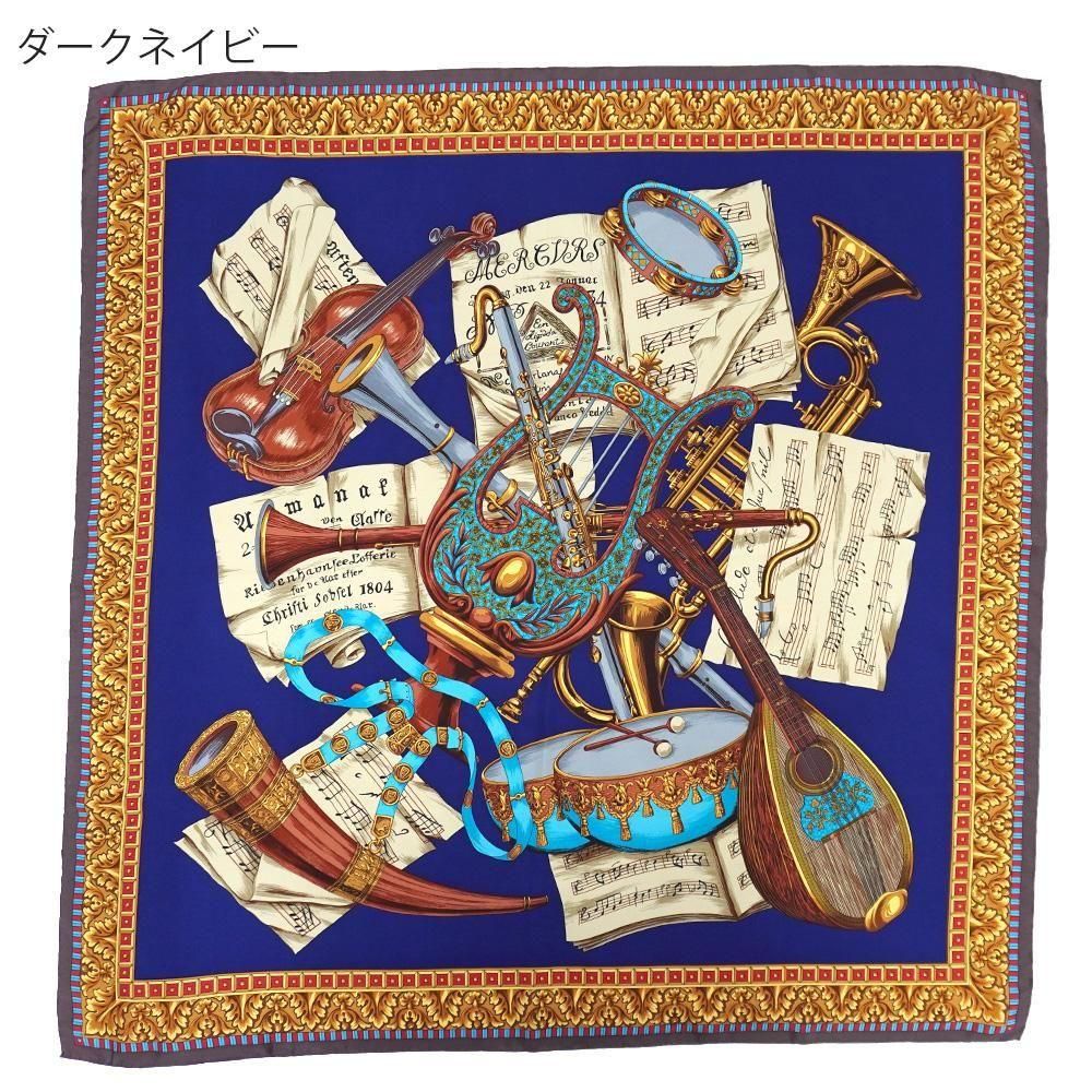 竪琴やリュート、タンバリンなどの古典的な楽器と楽譜が描かれたスカーフです。