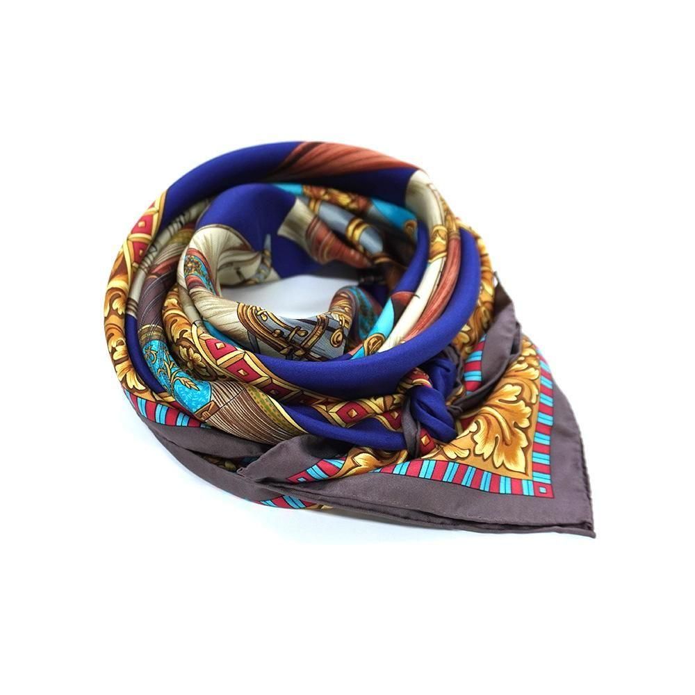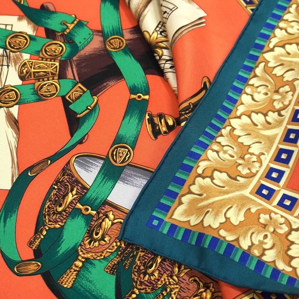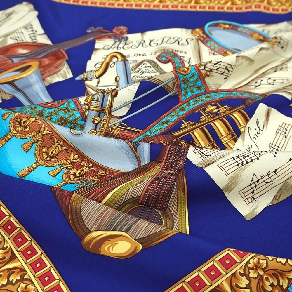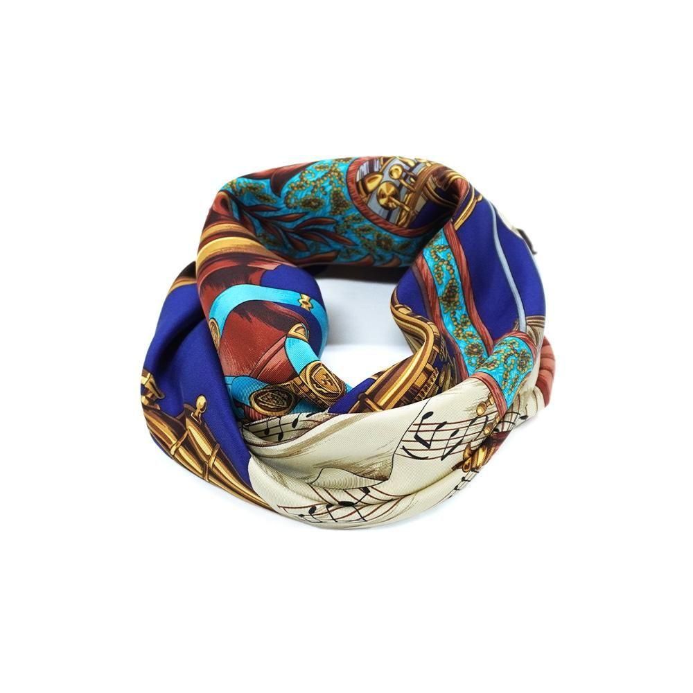 竪琴やリュート、タンバリンなどの古典的な楽器と楽譜が描かれたスカーフです。